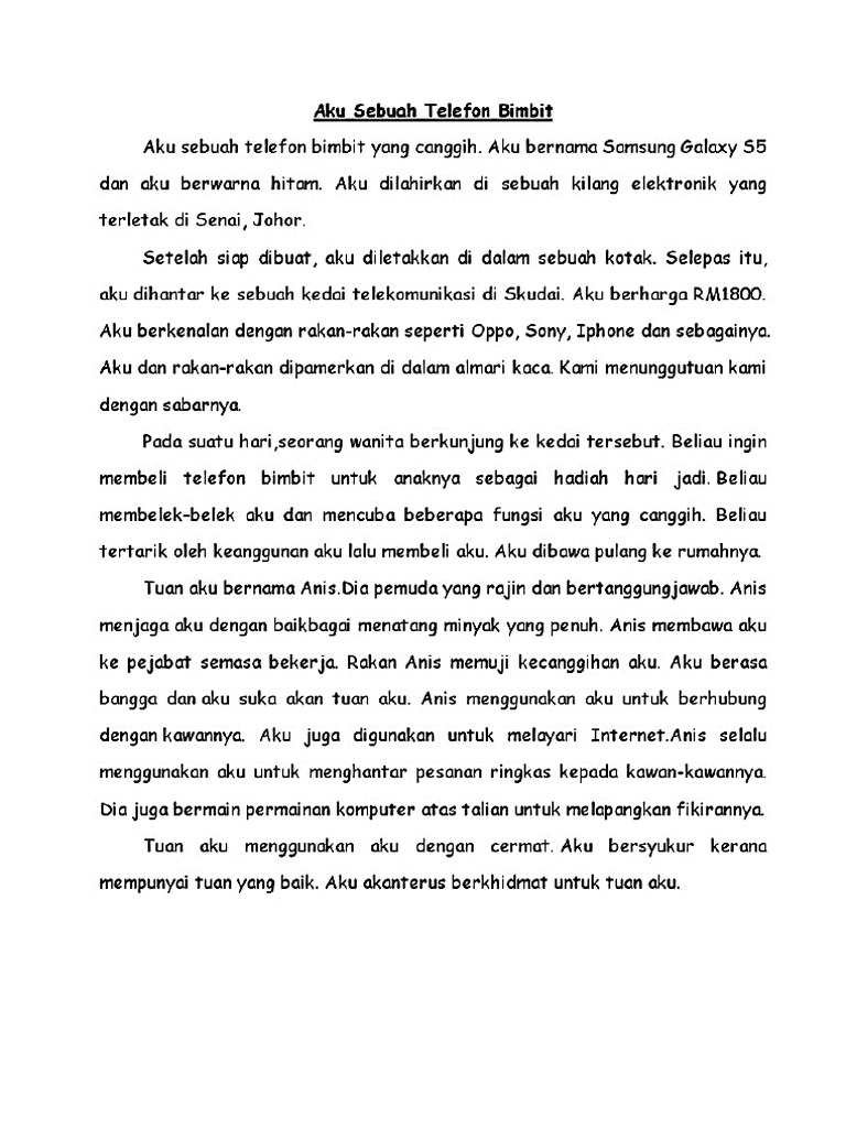 Aku dilahirkan di sebuah kilang di korea. Pada zaman modenisasi ini, semakin banyak orang menggunakan telefon bimbit dalam kehidupan. Aku dihantar ke muar, johor. Telefon bimbit 1 merupakan peranti eletronik mudah alih digunakan sebagai alat perhubungan suara atau data melalui jaringan stesyen pengkalan yang dikenali sebagai tapak sel. 2020 mail order tips (upsr pt3 spm) 2020 pt3 exam tips 2020 seminar upsr pt3 spm @ universiti malaya 2020 spm ini hanyalah kisah tentang aku, sebuah telefon bimbit kepunyaan zaleha yang telah mati secara mengejut dipanah kilat sewaktu hujan lebat.