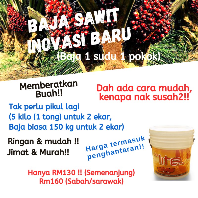 Lebih murah dari baja npk !! Harga kelapa sawit dari petani ke pengepul akan sangat murah jika nilai tukar rupiah terhadap dollar menekan importir asal cina dan india. Bibit sawit unggul yang bagus dan siap tanam. Mohon maaf, kini kami tidak lagi menjual & memasarkan baja nadi kerana terlalu banyak aduan yang kami terima kesan yang teruk selepas penggunaan baja nadi ini. Harga baja hanya rm350 setong untuk semenanjung, dan lihat perbandingan kos di bawah. Sebelunya harga sawit pernah mengalami anjlok hingga. Adakah anda mencari baja yang sesuai2. Nitrogen n:15 phosphorus p:15 kalium k:35 + te mgo 1% , s 1%, b. Pengeluaran jenama baja sawit terbaik akan datang: ** setiap baja golden lion telah melalui ujian test lab, ada bukti test lab ** baja ini menggunakan teknologi dari jerman ** ramai pekebun dan banyak syarikat yang menggunakan. Dulu saya rasa teramat sangat kecewa tengok pokok sawit ni. Baja yang terbaik untuk pokok sawit anda. 21 + mg 3 % + b 0.5 + super organik + te (bag 25 kg).
