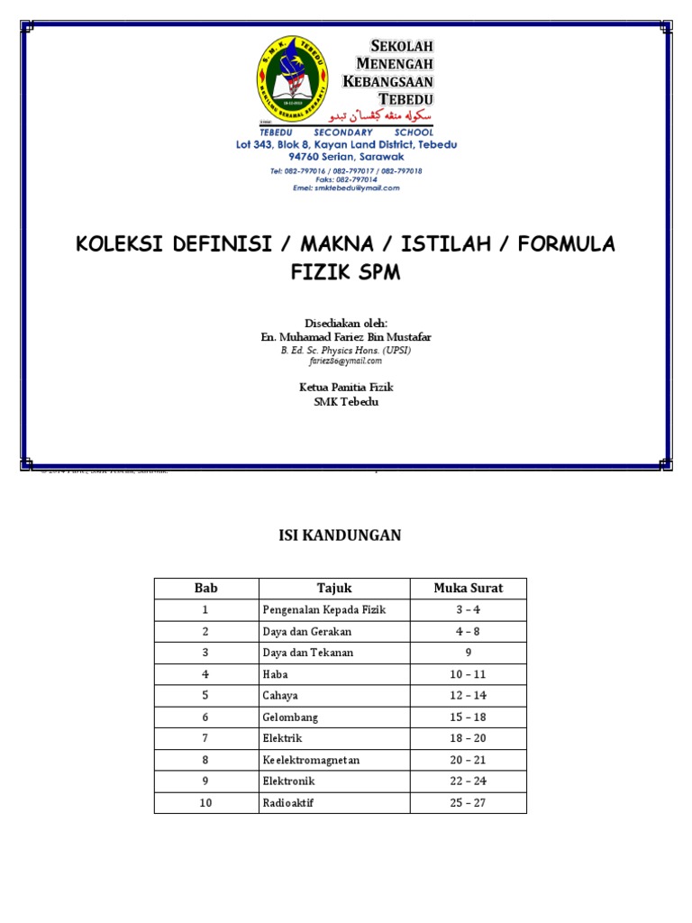 Fizik tingkatan 4 bab 1full description. Ministry of education malaysia integrated curriculum for secondary schools curriculum specifications physics form 4 curriculum development centre ministry of education malaysia… fizik tingkatan 4 (1). Pelajaran/hsp_ fizik tg.4bm.pdfâ â· 2015, iaitu tahun akhir peperiksaan sijil pelajaran malaysia disediakan dalam dwibahasa. Bu bilim dalı içerisinde birçok kuralı ve formülü fizik formülleri, hem üniversiteye giriş sınavlarındaki sorularda hem de günlük hayatta birçok yerde kullanılır. Perbincangan latihan formatif 6.4 tajuk formula kanta nipis bab 6 tajuk cahaya fizik kssm tingkatan 4 #akademiyoutuber.
