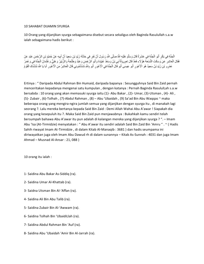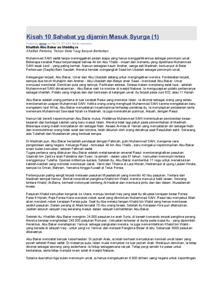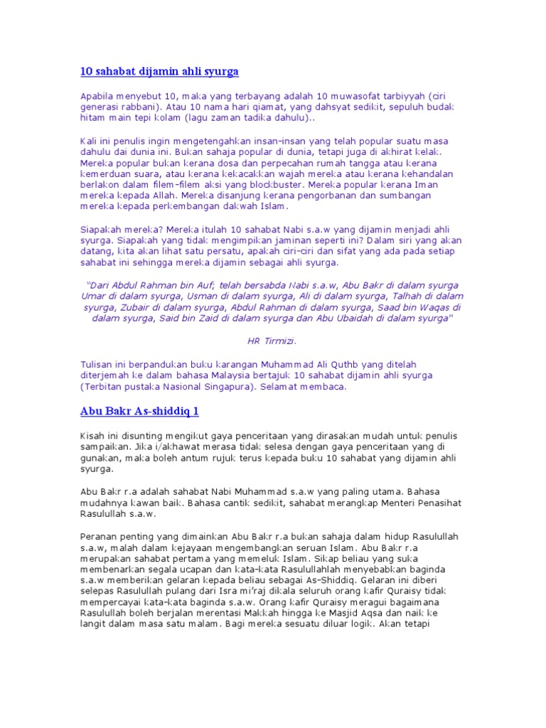 10 Sahabat Yang Dijanjikan Syurga from imgv2-1-f.scribdassets.com Music composed by serge essiambre entitled, 'believe in yourself'. Saad bin abi waqqas r.a; Yang mana sejak hidup di dunia lagi mereka telah dijanjikan syurga oleh allah. Inilah 10 sahabat nabi yang dijamin allah masuk surga 1. Keutamaannya, abu bakar adalah seorang. Lalu nabi saw bersabda, ada sepuluh orang yang mendapat khabar gembira masuk syurga, iaitu : Ali bin abi thalib r.a; Kenali 10 sahabat yang dijamin syurga 1.