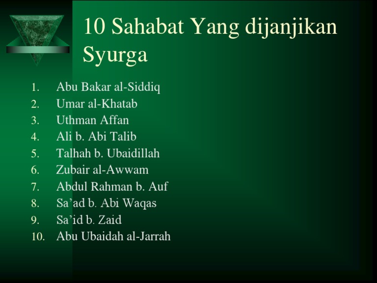 Lalu nabi saw bersabda, ada sepuluh orang yang mendapat khabar gembira masuk syurga, iaitu : Berikut 10 sahabat nabi yang dijamin masuk surga yang dirangkum detikcom. Khalifah pertama, teman setia yang banyak berkorban. Antara salah soerang yang paling dikasihi oleh rasulullah s.a.w ketika baginda masih hidup. Saad bin abi waqqas r.a;
